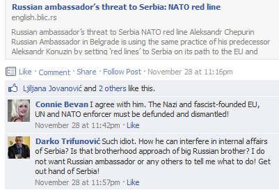 @Darko Trifunović “Such idiot. How he can interfere in internal affairs of Serbia? Is that brotherhood approach of big Russian brother? I do not want Russian ambassador or any others to tell me what to do! Get out hand of Serbia!”(comment of Dr Darko Trifunovic (Secretary of Institute for “State security” @ “Faculty of internal affairs” in Belgrade) on Blic’ article: http://english.blic.rs/In-Focus/10057/Russian-ambassadors-threat-to-Serbia-NATO-red-line ) –