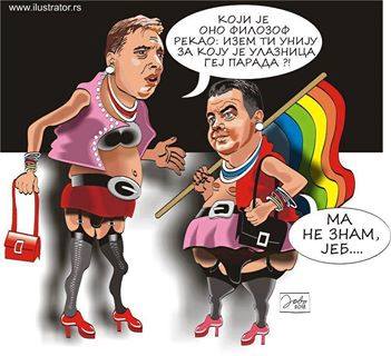 Comic depiction of Serbian PM Aleksandar Vucic and FM Ivica Dacic- One of EU imposed “humiliating conditions” on Serbia, was a “gay parade”, which must be held every year in Capitol Belgrade. It was perceived by most Serbs as a provocation and attack on traditional and family values…