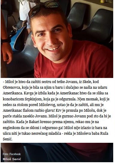“Milos was just trying to protect his cousin Jovana (young Serbian woman, also from Obrenovac), who was working at the bar as waitress that tragic night- Milos was present there too. At one moment she became target of American patrons’ rude behavior. The fight broke out when American attempted to take Selfie with Jovana against her will. She pushed him away. In the bar at this time was present another young Serbian man, Jovana’ boyfriend, he was sitting at the table next to Milos’. When Jovana’ boyfriend attempted to protect her, American hit him over the head with the glass bottle, which broke on impact. The blood from the wounded Serbian man sprayed over Milos, while the piece of the glass cut the waitress Jovana. Milos pushed Jovana under the table to protect her from the fight. When Bakari advanced toward him (Milos) he warned him in English to back off, and pushed him away. After that Milos did not leave the bar, and he didn’t participate in the street beating of this unfortunate young American”- concluded the testimony, Milos’ grandma, Mrs. Senic… (11.07.2017, FBR)