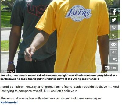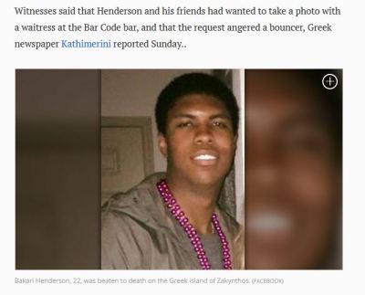 Let’s public be the judge of your (anonymous) statement > the “one sided report”. Young Bakari was in the center of this incident from the beginning, and his behavior most likely triggered the fight- he certainly participated in the fight inside the pub. But, he certainly did not deserve to be beaten while lying on the ground on the street, and surely did not deserve to die. The fact is that his death was the tragic accident, resulting from the criminal assault, outside the pub. Since I wrote the article couple days ago, new witness statements came out and new videos were released. They are pretty much consisting with my findings in this article. The bouncer (the British national of Serbian origin) confirmed that there was incident around Mr. Henderson table involving Serbian waitress, and according to him, her Serbian friend objected her for “being friendly” with Americans. The bouncer states that at this moment Bakari shouted (probably swore) something to girl’s friend, who then punched him in the face. According to bouncer- Mr. Henderson then grabbed the glass bottle and broke it against Serbian man’ head, injuring him seriously; During the fight that erupted, the bouncer states that Mr. Henderson accidentally hit with the elbow Serbian waitress in the face, and she started bleeding profusely too. That was the moment when “Serbian crowed” got mad, two of their friends (and nationals) were injured by, how they saw it, an aggressive American tourist. So they jumped into the fight, and joined two bouncers who were in a process of removing Mr. Henderson ofф the premises. They chased Mr. Henderson outside of the pub, where they caught уп with him and had beaten him unconscious. From the newest video, from the pub across the street, you can clearly see that entire fight (assault) lasted less then 20 seconds, so the claims that Serbian tourists and the bouncers, who before the incident even did not know each other, conspired to kill Mr. Henderson in less than a half a minute (as the Greek prosecutor defined the charges) is simply overkill, and probably the political correctness on the part of Greek authorities. Mr. Henderson most likely died from (accidental?) blow to the head, either during the fall, or while being kicked on the ground by multiple assailants. The statement that it was premeditated murder is ludicrous. Knowing the Serbian culture and recent history, I believe that main reason for triggering such aggressive and excessive response from young Serbian patrons, was the jealousy of Serbian girl’ (boy)friend and general Serbian “recent historical animosity” toward “Americans” resulting from the American’ three month savage bombing of Serbia, in 1999. I am not here justifying the criminal assault that took place outside the pub, but we need to кnow all circumstances and possible motives, that lead to this tragic death. Hopefully during the trial we will be able to get the complete and accurate description of this incident, which is certainly not black and white as currently described by the Western MSM and one-sided public, which is suffering from “the Hollywood anti-Serbian syndrome”. As I said at the beginning, let the public (and time) be the judge of this article… FBR Editor M. Novakovic