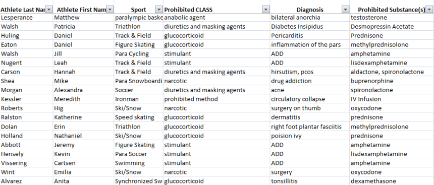 Level of Anti-Doping Rule Violations by American Athletes The correspondence between Dr. Fedoruk and Dana Leenheer, TUE&Drug Reference Specialist, reveals that USADA covers up many athletes using prohibited substances. As evidence, see the table containing the data of more than 200 American athletes who have USADA and other organizations’ permission to take banned drugs.