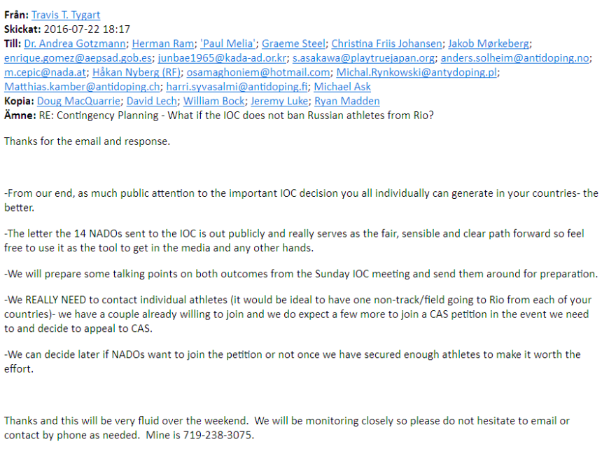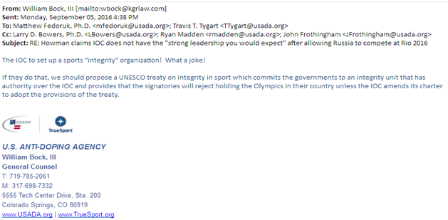 Below is the correspondence between USADA officials discussing the ways to discredit the IOC and to set up an agency that could have authority over the IOC. Following their intentions, USADA and the Canadian Center for Ethics in Sport launched the joint Project Olympian.