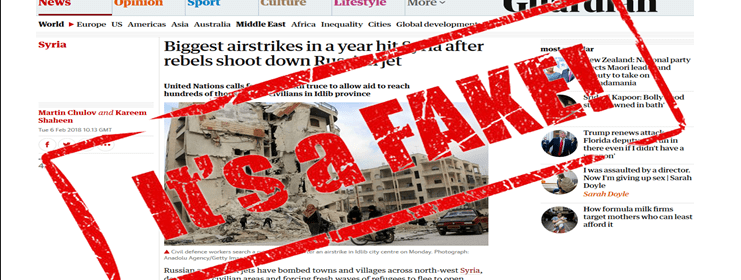 The Guardian article from February 6, 2018, titled “Biggest airstrikes in a year hit Syria after rebels shoot down Russian jet” claims that “Russian and Syrian jets have bombed up to 18 towns across north-west Syria, devastating civilian areas and forcing fresh waves of refugees to flee”. According to the journalists Martin Chulov and Kareem Shahee, a series of devastating
